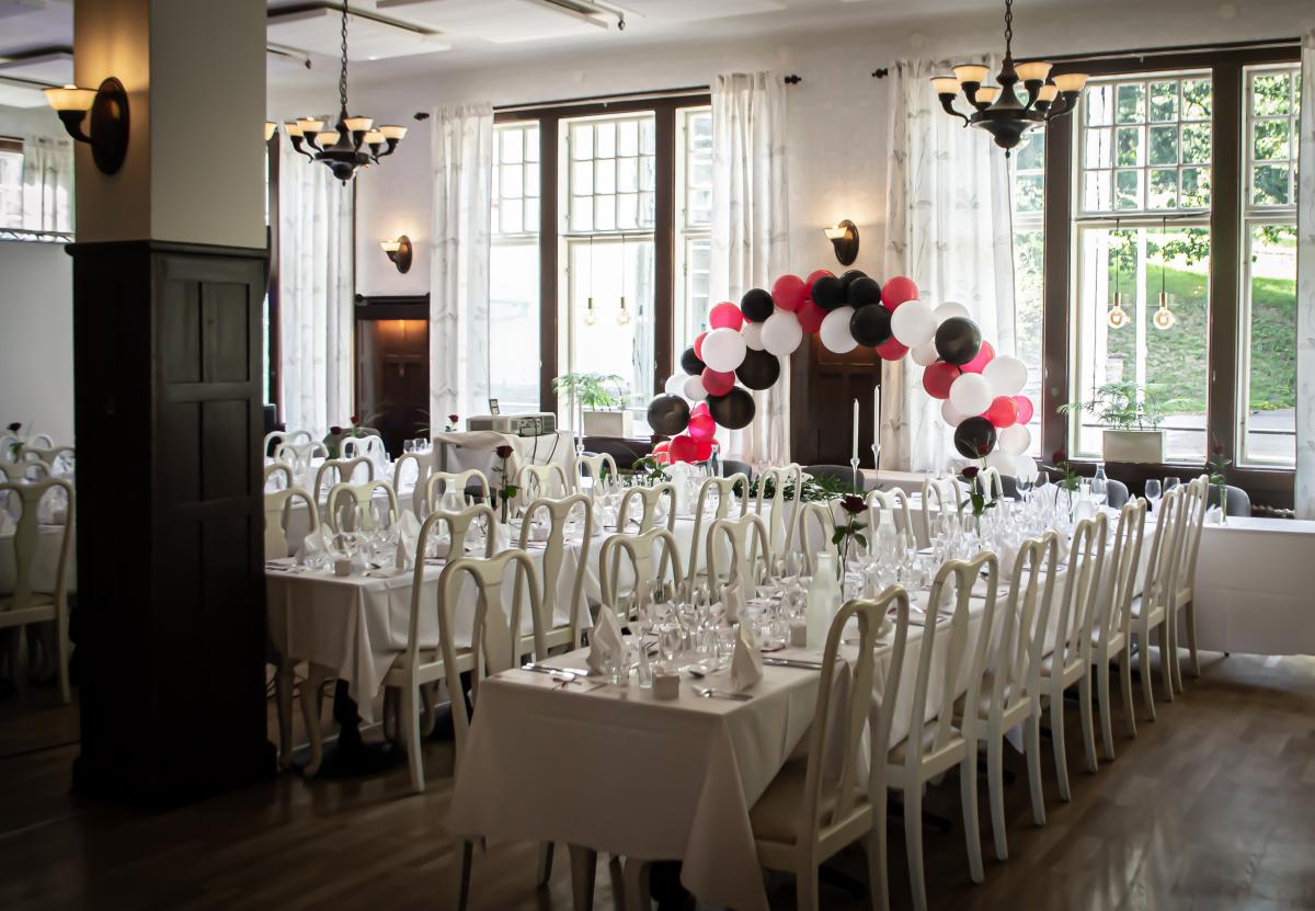 Bröllopsfesten kommer hållas på anrika Mössebergs Kurort. Festen startar 17:00 med mingel, snittar och mouserande vin. Det går bra att komma direkt efter kyrkan. Under kvällen kommer det serveras trerätters middag och då ingår dryck till maten. Önskar man förtära dryck utöver det som ingår vid maten kan man det köpa på kurorten. Dom har bar med fulla rättigheter fram till kl. 02:00. Bröllopstårta med kaffe blir det självklart. Men för att vi ska orka dansa hela natten kommer det också serveras pizza slice lite senare på kvällen.